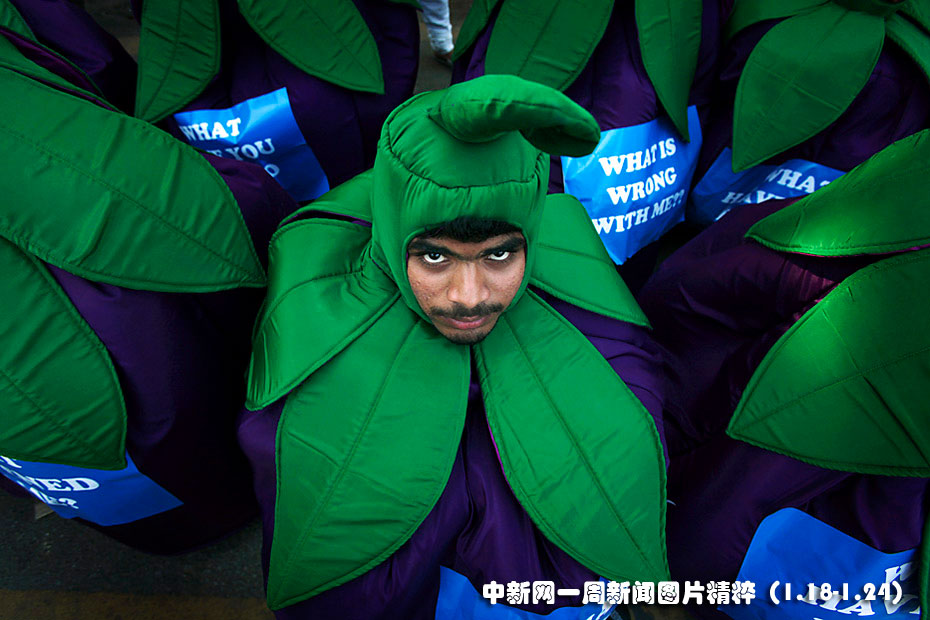 1月22日,印度班加罗尔绿色和平组织的活动者打扮成茄子抗议食用转基因茄子。图片来源:中国新闻网