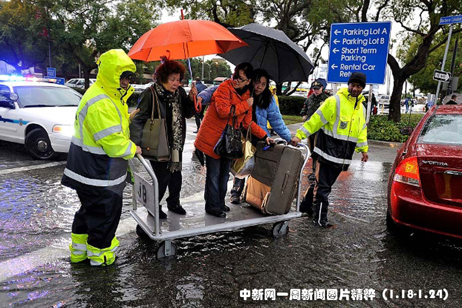 1月20日,在近期遭受暴风雨袭击的加州长滩地区,捷蓝航空公司工作人员帮助乘客穿过被水淹没的机场停车场。图片来源:中国新闻网