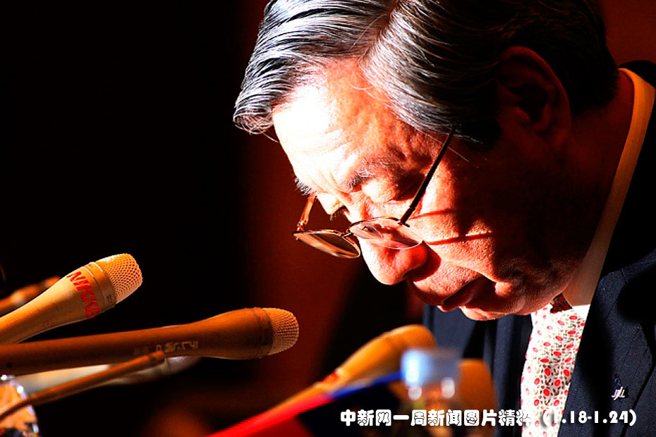 1月19日,负债256亿美元的日本航空公司申请破产保护。图为日航总裁西松遥当天在东京为公司破产鞠躬致歉,并宣布辞职。图片来源:中国新闻网
