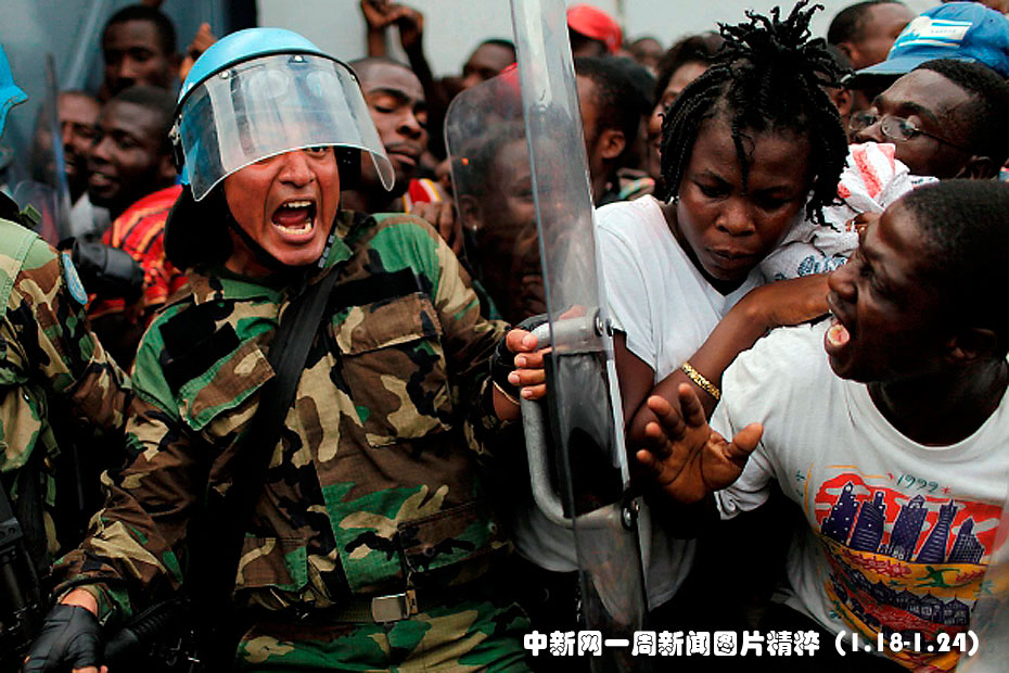 1月19日,在海地太子港,一名秘鲁维和人员在试图控制食品发放过程中混乱的人群时发出尖叫。图片来源:中国新闻网