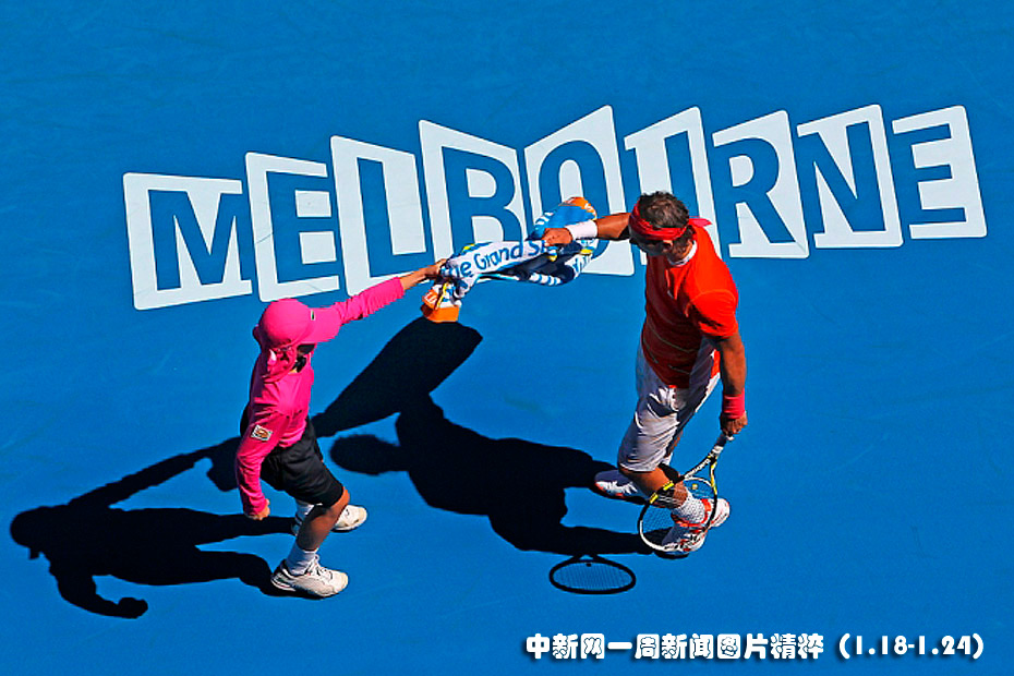 1月20日,在于墨尔本举行的澳大利亚网球公开赛上,西班牙球手纳达尔在对阵斯洛伐克球手拉科的比赛中从球童手中接过毛巾。纳达尔最终击败拉科晋级。图片来源:中国新闻网