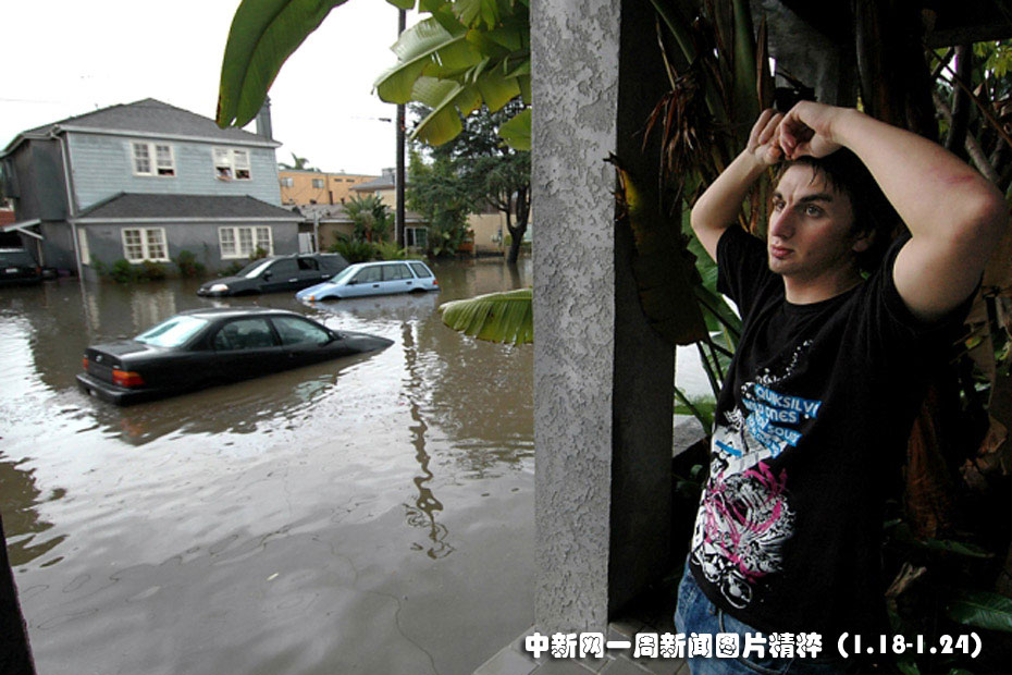 1月19日,罗杰斯在雨水涌进家中之后在邻居的门廊下躲避。因另一场太平洋暴风雨在向美国南加州地区逼近,迫使数百名居民撤离。图片来源:中国新闻网