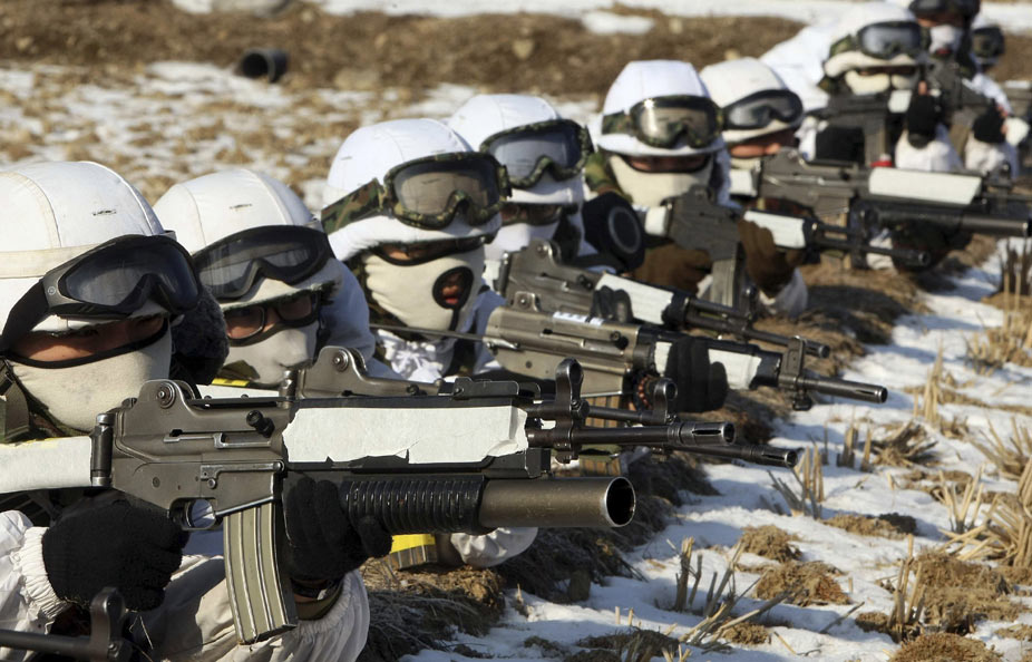 1月27日,韩国江原道,韩国陆军部队在严寒中进行战术训练。