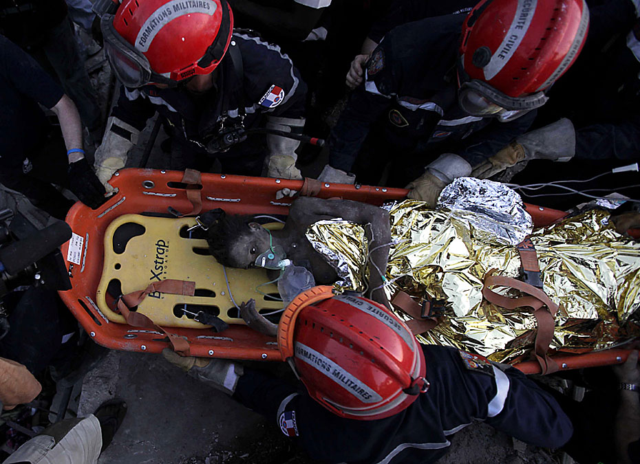 2010年1月27日,海地太子港,法国救援人员在一栋房屋的废墟下救出被困15天的16岁女孩黛琳娜·艾提尼(Daline Etienne)。女孩微弱的话语让大家着实吃惊:她竟是凭着随身的可乐挺了过来。图片来源:中国新闻网
