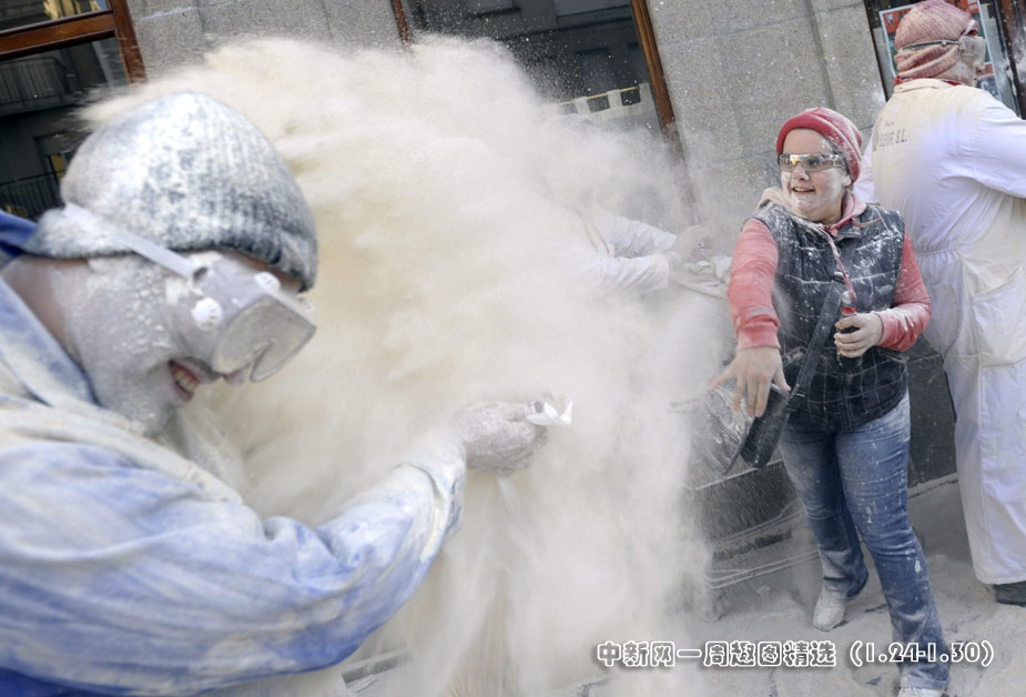 1月24日,西班牙西北部的一座村庄举办的狂欢节中上演疯狂的“面粉大战”。 图片来源:中国新闻网>>点击观看详细内容