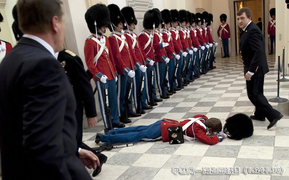 1月27日,丹麦女王在首都哥本哈根设宴款待议会议员,一名皇家卫兵突然晕倒在地,不知是否站得太久饿晕了。图片来源:中国新闻网>>点击观看详细内容