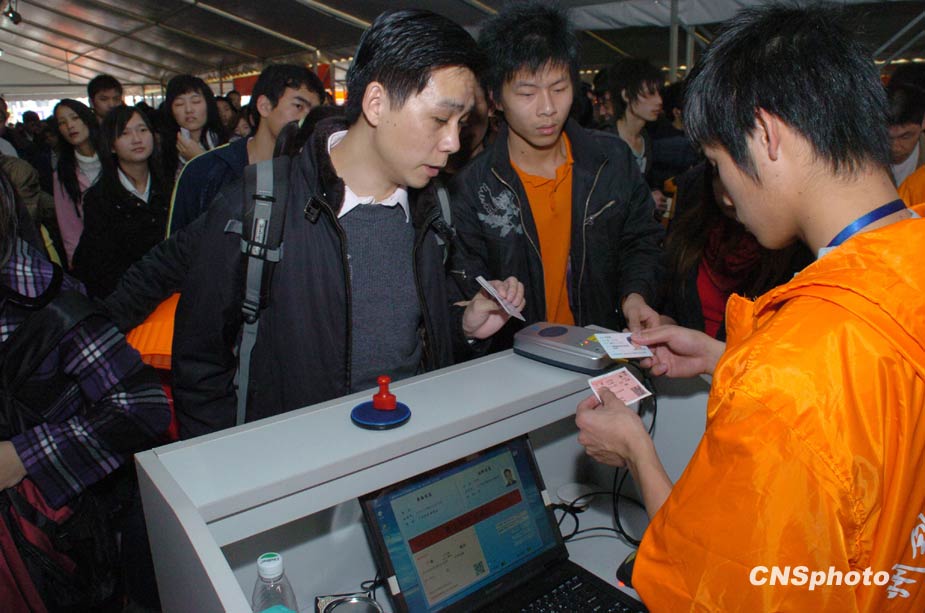 一年一度的春运今日起正式开始。2010年的春运从1月30日起至3月10日,为期40天,其中节前15天,节后25天。据权威预测,今年春运客运量料超25亿人次。图为1月30日,广州火车票实名制正式开始,乘客只需要将身份证和车票在验证设备上一刷,电脑上就能显示出相关信息,核对之后,验票人员在车票上盖章放行。中新社发 罗仰明 摄