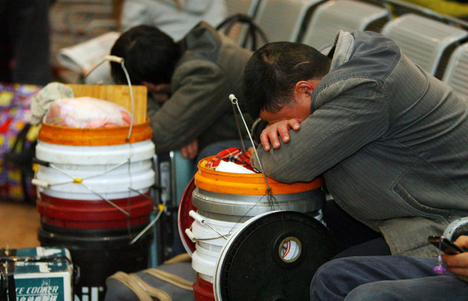 一年一度的春运今日起正式开始。2010年的春运从1月30日起至3月10日,为期40天,其中节前15天,节后25天。据权威预测,今年春运客运量料超25亿人次。图为1月30日,几名旅客在西安火车站候车大厅熟睡。 侯智 摄