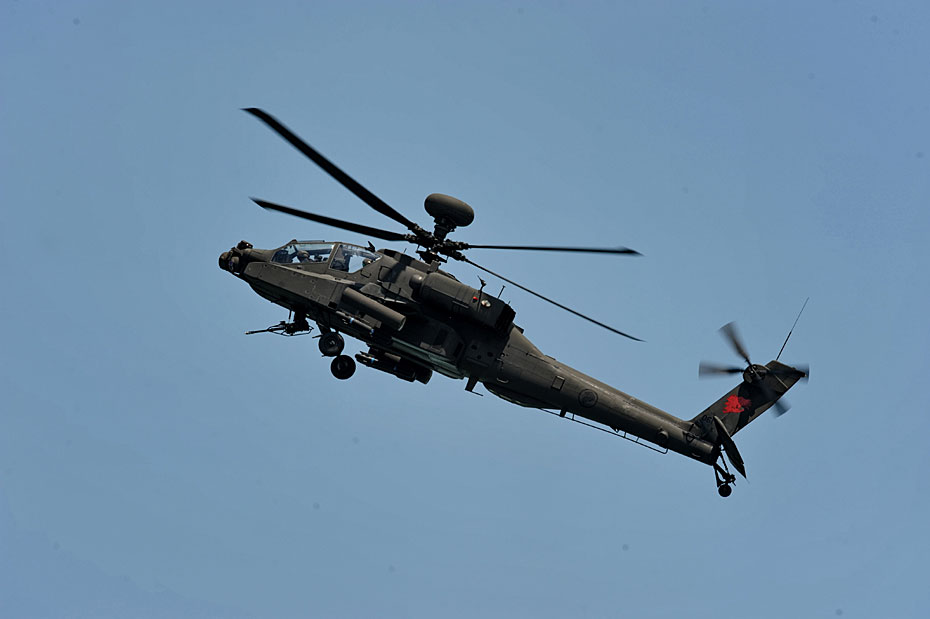 图为AH-64阿帕奇武装直升机在进行飞行表演。