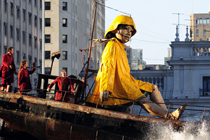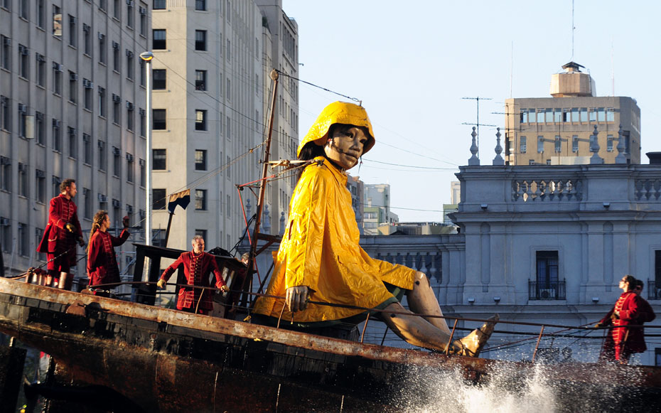 近日,智利首都圣地亚哥街头,法国一剧团携巨型提线木偶“小巨人”上街表演,它惟妙惟肖的表情和逼真的神态引得周围观众的阵阵掌声。图片来源:中国新闻网
