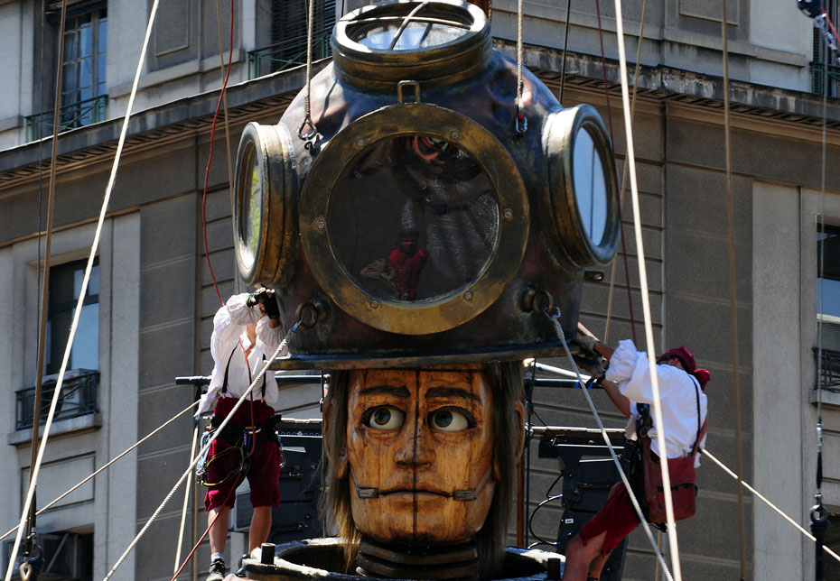 近日,智利首都圣地亚哥街头,法国一剧团携巨型提线木偶“小巨人”上街表演,它惟妙惟肖的表情和逼真的神态引得周围观众的阵阵掌声。图片来源:中国新闻网