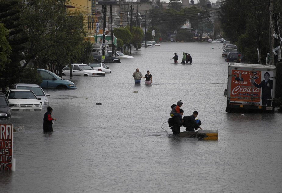 近日,墨西哥中部地区遭遇暴雨引发洪水,给当地的道路交通造成严重影响。图为2月4日,人们穿行在被洪水淹没的街道。
