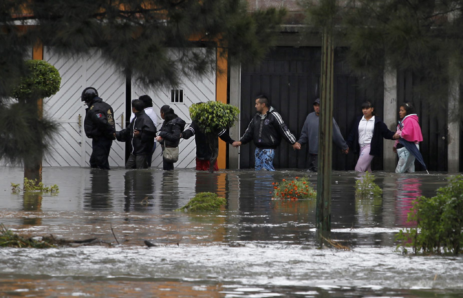 近日,墨西哥中部地区遭遇暴雨引发洪水,给当地的道路交通造成严重影响。图为2月4日,人们穿行在被洪水淹没的街道。