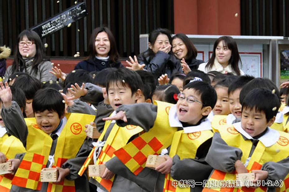 2月3日,日本首都东京,幼儿园小朋友们在“节分”的撒豆驱邪仪式上投掷大豆。图片来源:中国新闻网>>点击观看详细内容