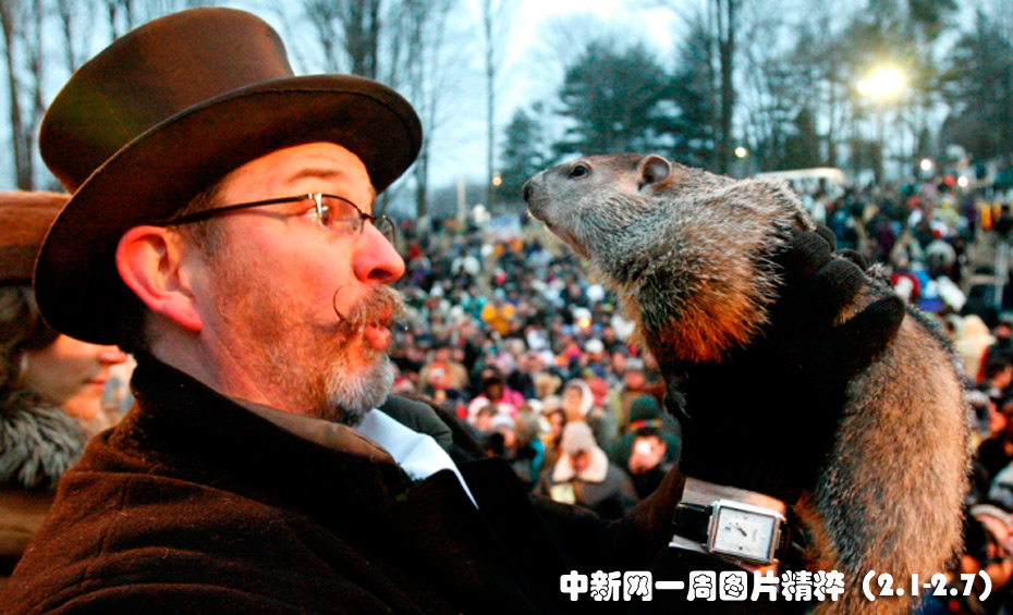 2月2日(周二),在美国宾夕法尼亚州的土拨鼠镇(Punxsutawney),本休斯(Ben-Hughes)抱着从地洞里爬出的土拨鼠菲尔,据说菲尔“看见”了自己的影子。根据传统,如果菲尔能看见自己的影子那就意味着冬季还要再延续六周。图片来源:中国新闻网