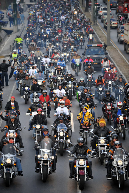 当地时间2月6日,在危地马拉首都危地马拉城,大约30000名摩托车手驾驶着机车在街头游行。