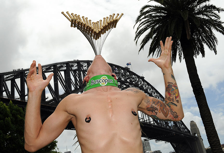2月8日,街头艺人Chayne Hultgren在澳大利亚悉尼海港大桥前,一次吞下18把厚约1.3厘米,长约50.8厘米的长剑,刷新了吉尼斯世界纪录。图片来源:中国新闻网