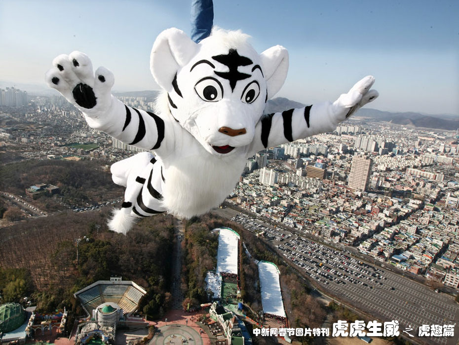 1月3日,为庆祝时隔60年迎来的白虎年,韩国大邱市民身穿白虎服装跳蹦极,向人们致以新年的问候。图片来源:CFP