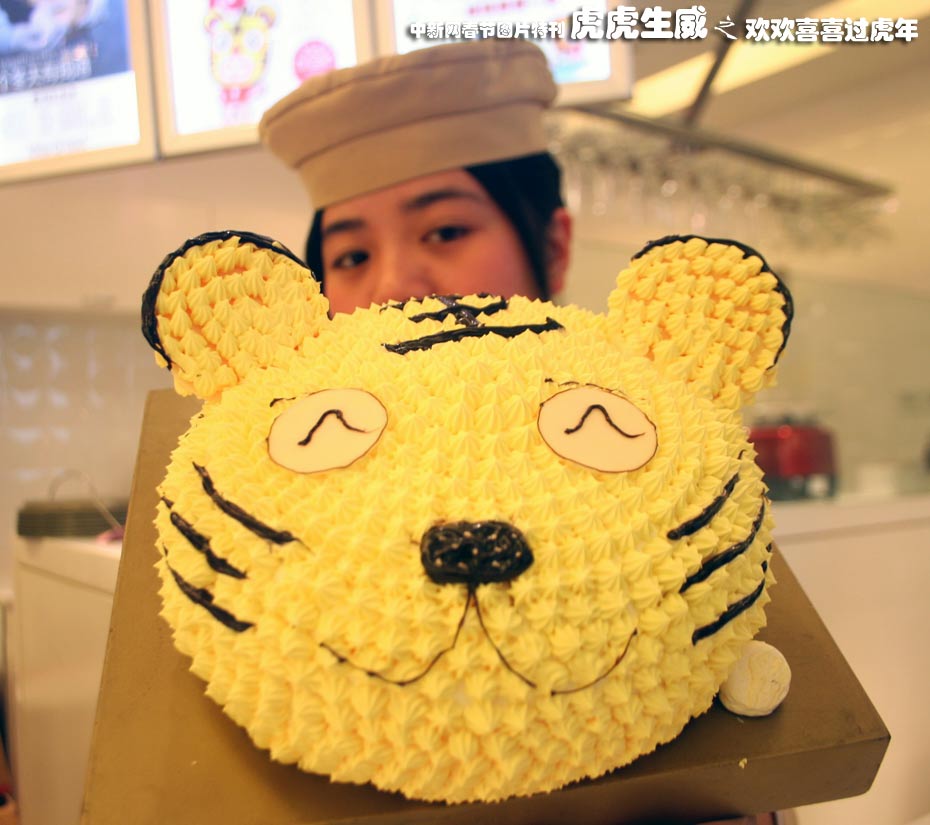 2月4日,浙江台州市蛋糕店的点心师展示卡通虎脸蛋糕。中新社发 王天荣 摄