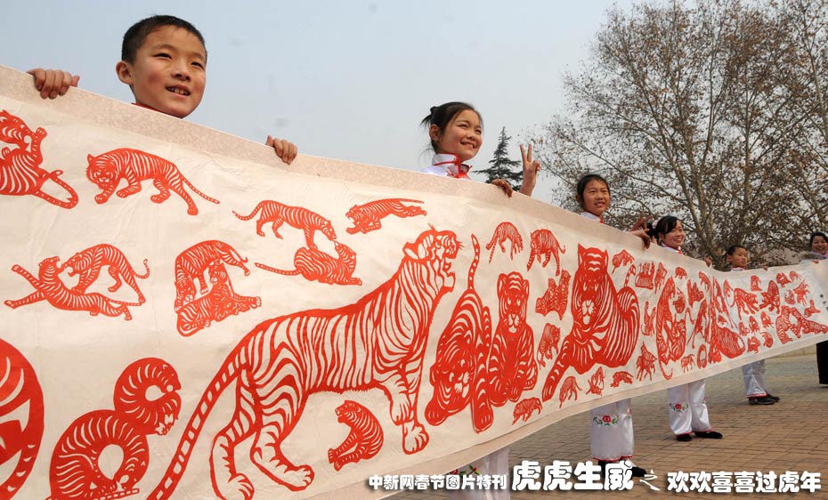 2月4日上午,洛阳市中州西路小学师生展示10米民间剪纸长卷《百虎争春》图。中新社发 张光辉. 摄