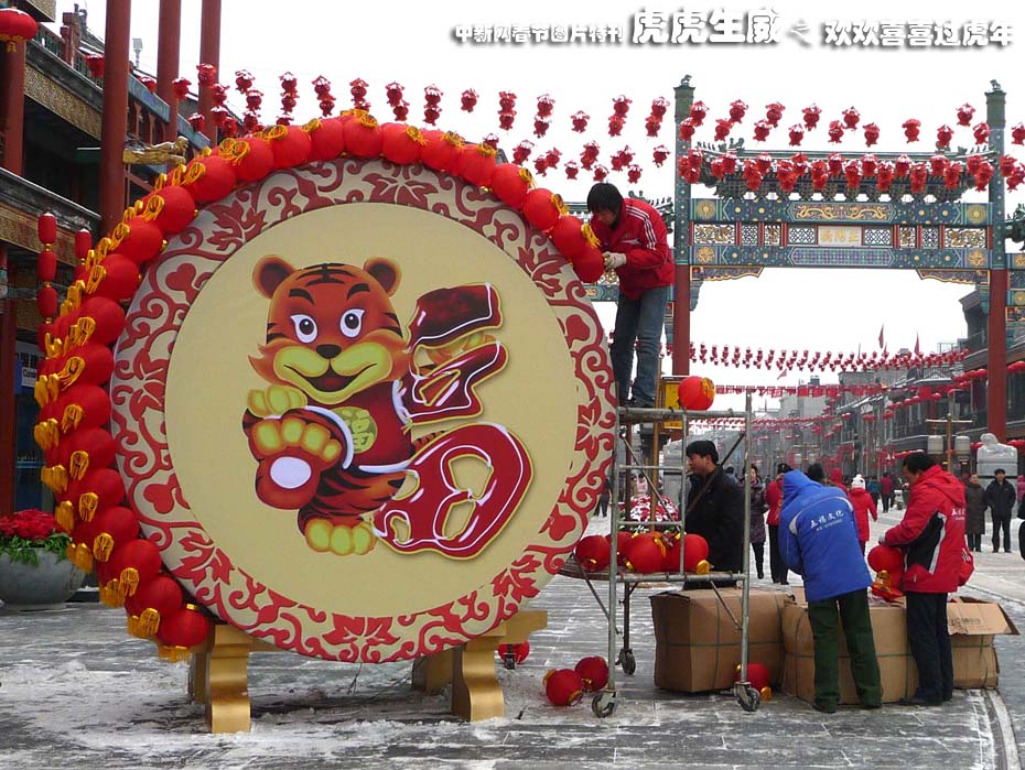 2月7日,两个直径3米左右的巨型“虎鼓”景观亮相北京前门大街,与万盏大红灯笼交相辉映构成一道充满喜庆氛围的靓丽风景,盛装迎接虎年新春的到来。中新社发 玉龙 摄