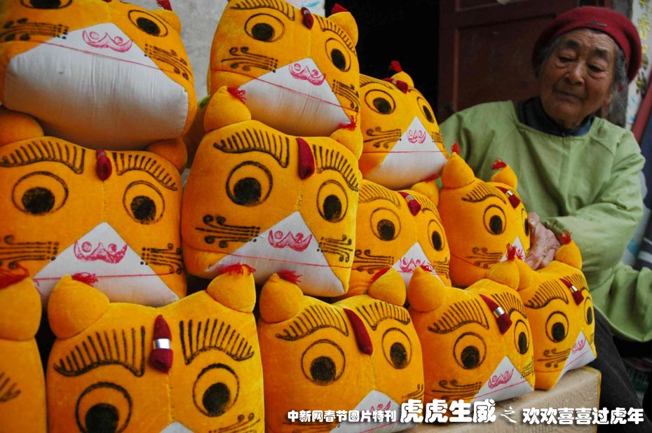 1月19日,河南省淮阳县民间老艺人马玲贤与她制作的“布老虎”在一起。今年85岁的马玲贤老太太制作“布老虎”已经有近20年,她制作的“布老虎”工艺精良,造型天稚气可爱。中新社发 杨正华 摄