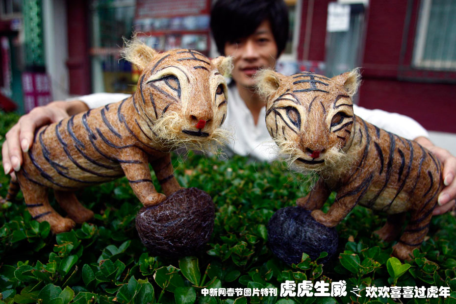 2009年11月9日,北京一位时尚发型设计师正在展示头发丝作品“福虎神威”贺岁虎年。这是祖国60华诞之后的又一新作,四川青年理发师黄鑫用2.6公斤碎头发制作了一对可爱逼真的“福虎”,历时两个多月的时间才完工。中新社发 郑雄增 摄