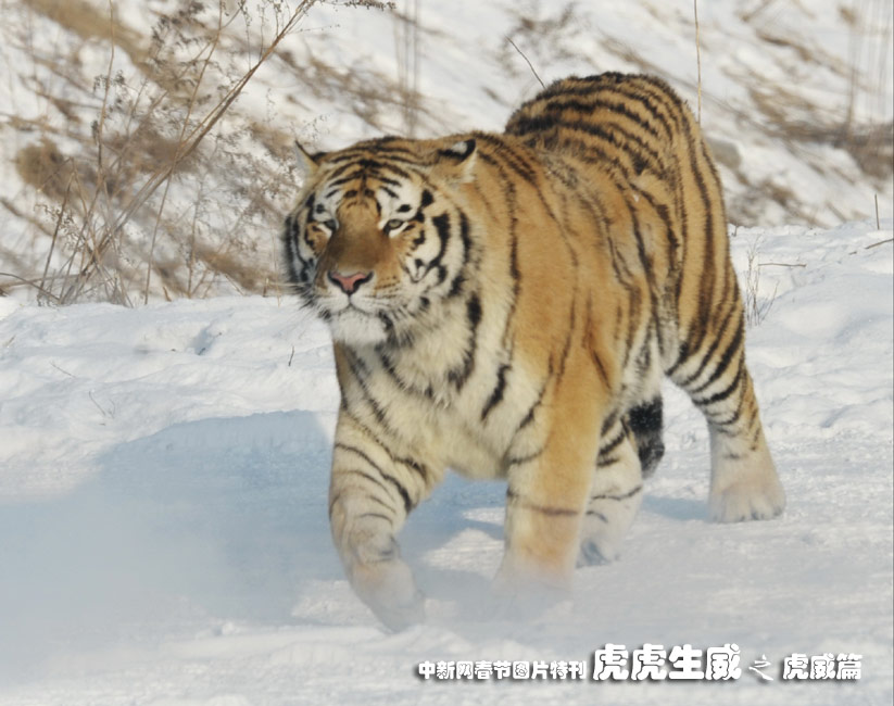 1月13日,黑龙江东北虎林园,老虎在雪地中嬉戏追逐。(王少华 张书俭 摄)