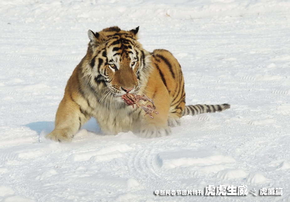 1月13日,黑龙江东北虎林园,老虎在雪地中嬉戏追逐。(王少华 张书俭 摄)