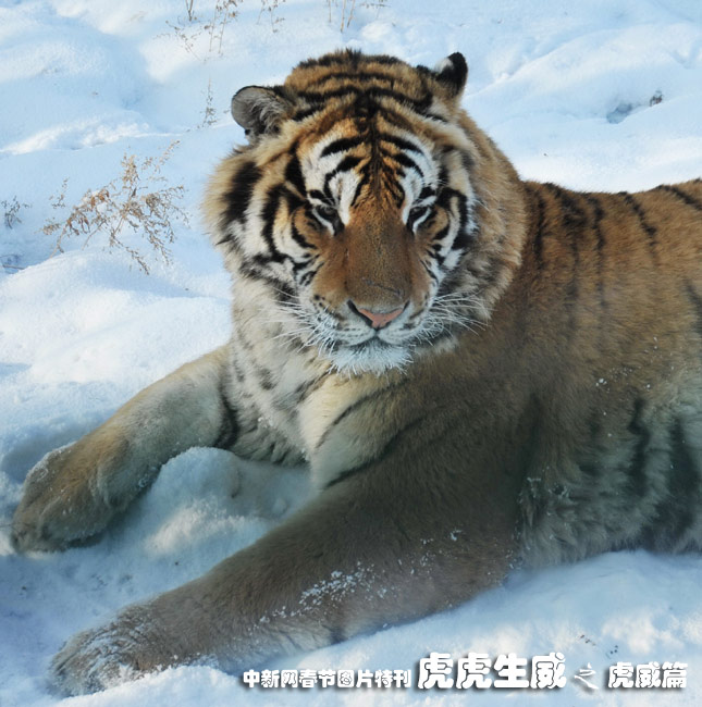 1月13日,黑龙江东北虎林园,老虎在雪地中嬉戏追逐。(王少华 张书俭 摄)