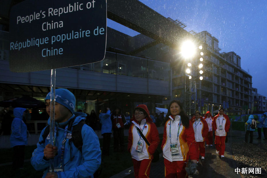 图为中国冬奥代表团冒雨参加升旗仪式。