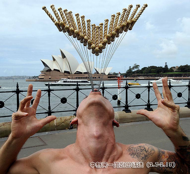 2月8日,街头艺人Chayne Hultgren在澳大利亚悉尼海港大桥前,一次吞下18把厚约1.3厘米,长约50.8厘米的长剑,刷新了吉尼斯世界纪录。图片来源:中国新闻网>>点击观看详细内容