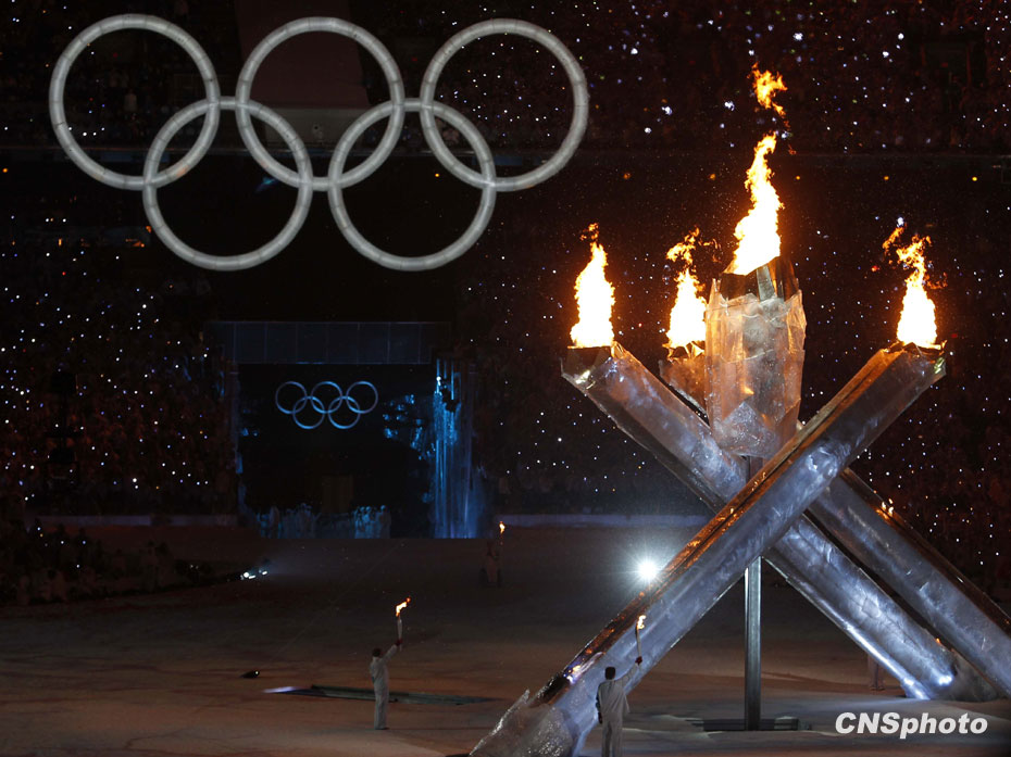 图为温哥华冬奥会主火炬在体育馆内点燃。