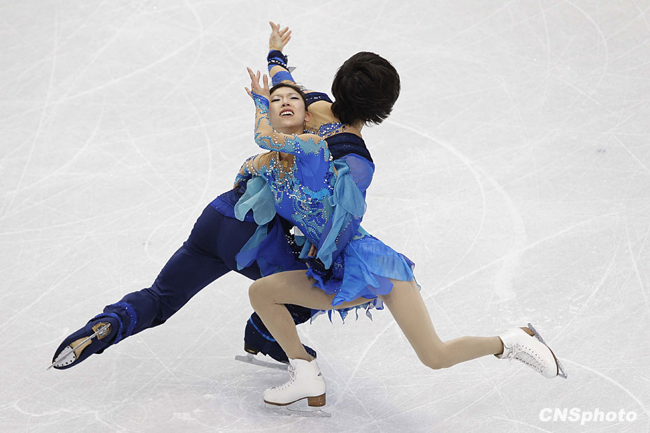 当地时间2月13日,中国花样滑冰队庞清/佟健、张丹/张昊在温哥华太平洋体育馆,利用最后的休息时间重复练习积极备战即将到来的比赛。中新社记者 盛佳鹏 摄