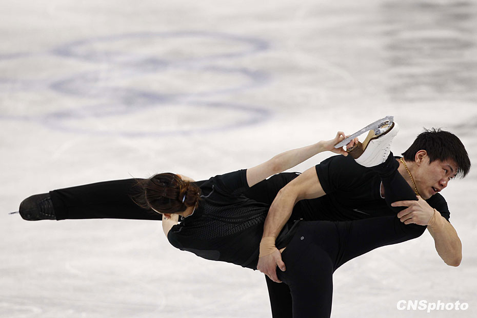 当地时间2月13日,中国花样滑冰队庞清/佟健、张丹/张昊在温哥华太平洋体育馆,利用最后的休息时间重复练习积极备战即将到来的比赛。中新社记者 盛佳鹏 摄