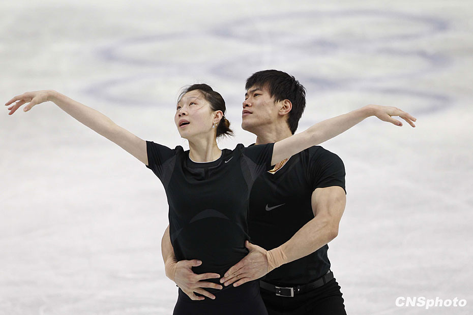 当地时间2月13日,中国花样滑冰队庞清/佟健、张丹/张昊在温哥华太平洋体育馆,利用最后的休息时间重复练习积极备战即将到来的比赛。中新社记者 盛佳鹏 摄