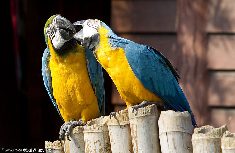 图为上海野生动物园,一对金刚鹦鹉在相互梳理羽毛。刘行喆/CFP