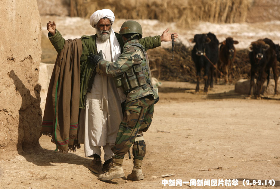 周五(12日),一名阿富汗士兵在检查从塔利班盘踞点出来的阿富汗农民。当日凌晨,驻阿联军出动1.5万名军人进攻了塔利班老巢马拉赫市。