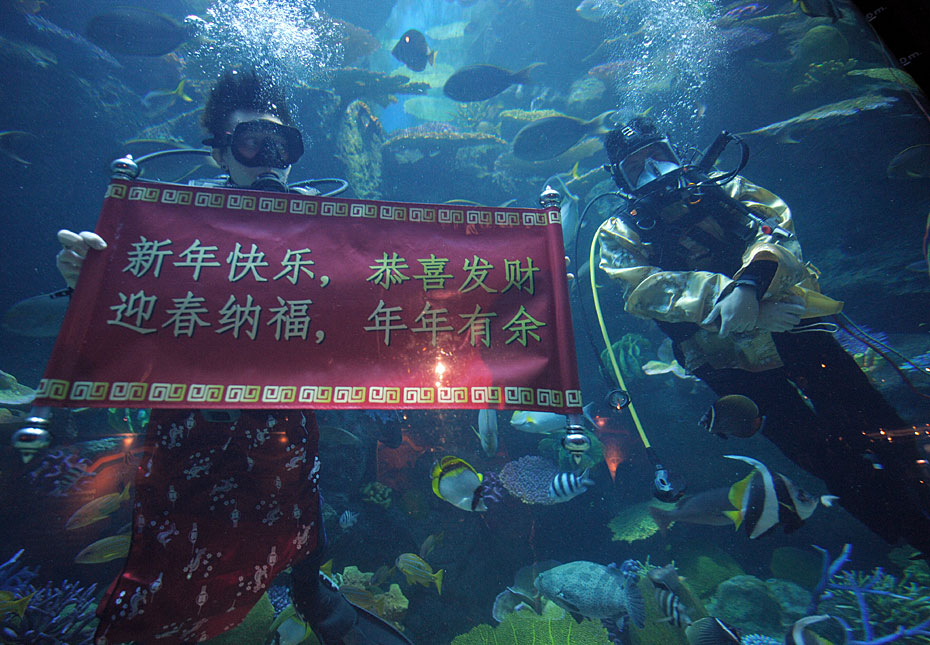 图为泰国曼谷水族馆潜水员在水中拉起横幅庆祝新春佳节。