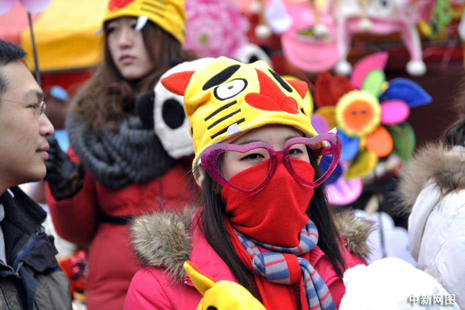2月14日,农历正月初一,北京各大传统庙会、洋庙会争相开幕,许多游客头戴虎年饰品开心游庙会。中新网记者 金硕 摄
