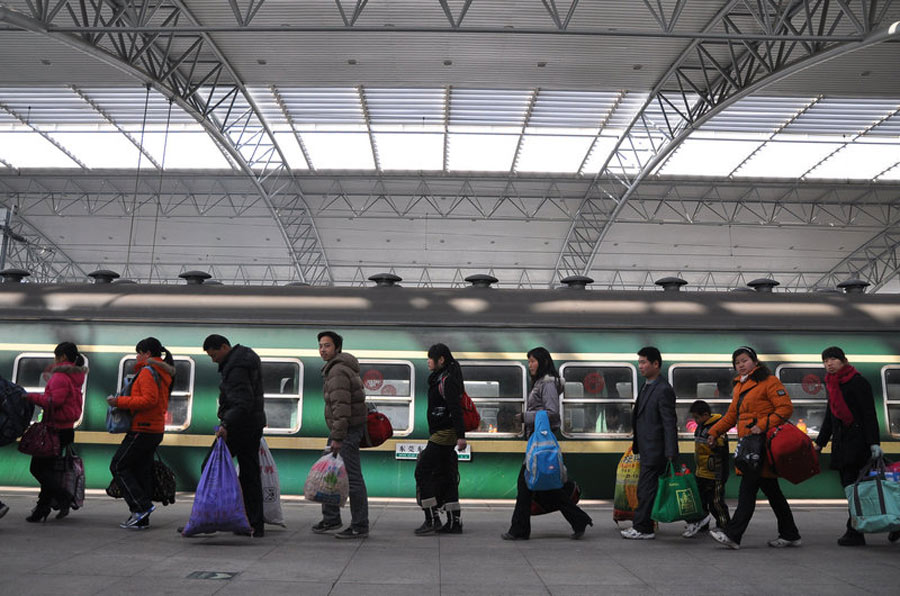 春节黄金周落幕,节日的气氛渐渐淡去,各地春运相继迎来返程客流高峰。图为2010年2月19日,旅客在安徽阜阳火车站站台排队上车。卢启建 摄