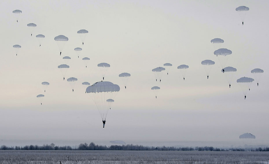 2月18日,俄罗斯第98空降师在莫斯科以东320公里的伊万诺沃市附近举行雪地空降演习。图片来源:中国新闻网
