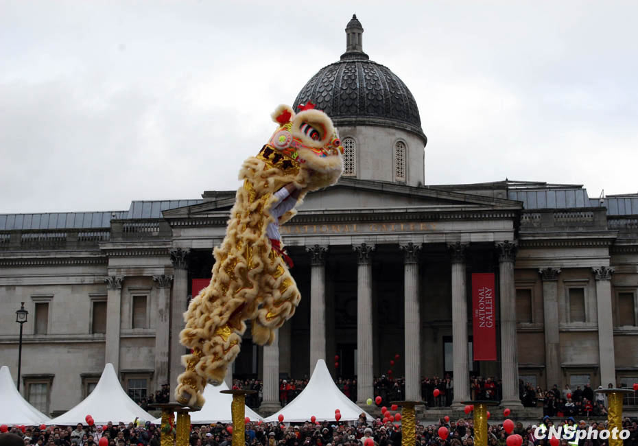 当地时间2月21日,亚洲之外最大规模的春节庆祝活动——伦敦春节庆典在伦敦特拉法加广场、莱斯特广场及伦敦华埠举行,图为当地侨社舞狮团表演的“梅花樁”,令现场数万观众发出惊叹。 中新社发 魏群 摄