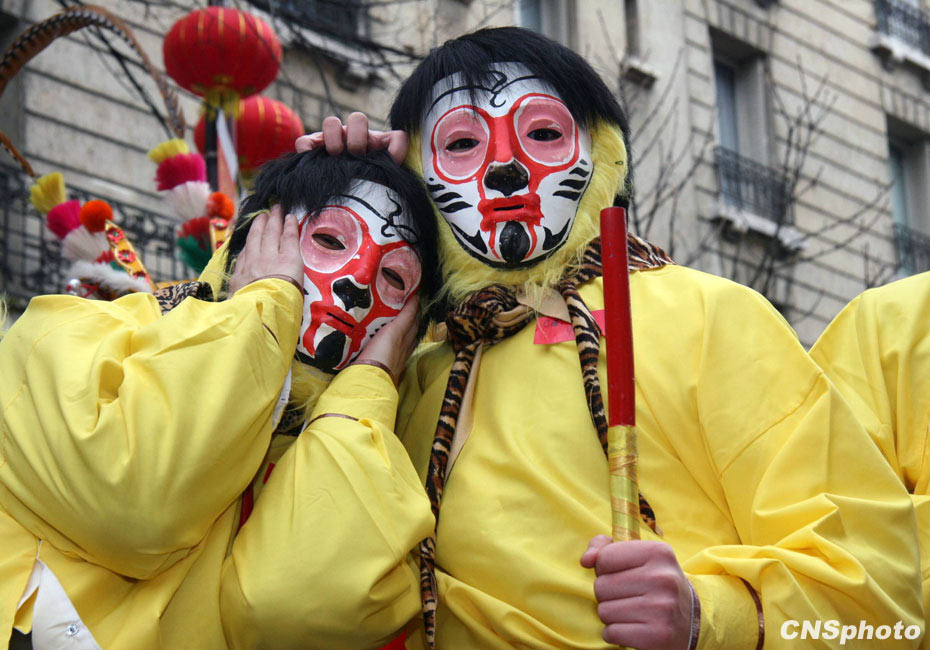 法国巴黎著名的“唐人街”——十三区21日下午举行虎年春节华人嘉年华大游行,给这个有着显著中国传统文化特色的华人聚居区带来了欢乐与喜气。图为游行队伍中的孙悟空造型。中新社发 吴卫中 摄