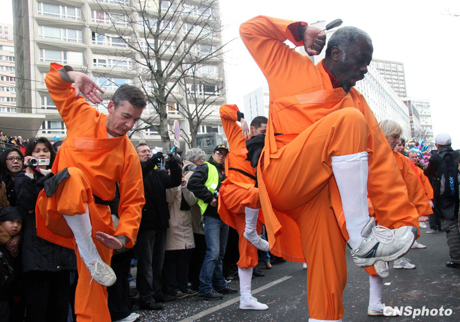 法国巴黎著名的“唐人街”——十三区21日下午举行虎年春节华人嘉年华大游行,给这个有着显著中国传统文化特色的华人聚居区带来了欢乐与喜气。图为洋武僧方阵表演中国功夫。中新社发 吴卫中 摄