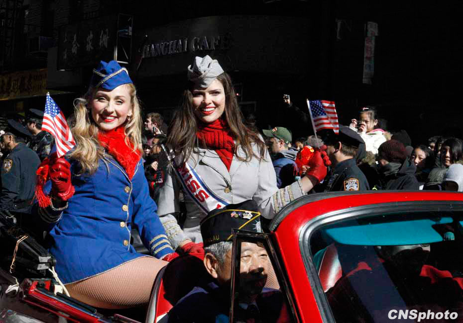 虎年纽约华埠庆祝农历新年“重头戏”花车大游行21日登场,吸引超过10万人围观共同狂欢,成为历年来参加人数最多的一次花车游行。12辆盛装花车以及数千人的表演团队沿着华埠最热闹的数十条街道一边行进一边表演,满天彩带飘扬,场面热闹非常。图为表演团队在行进中。中新社发 魏晞 摄