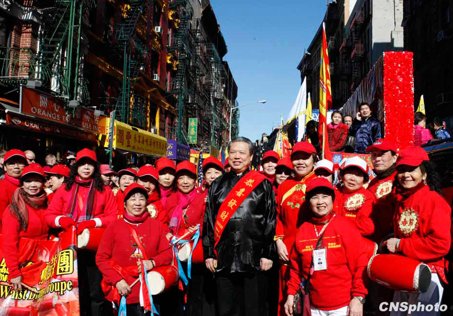 虎年纽约华埠庆祝农历新年“重头戏”花车大游行21日登场,吸引超过10万人围观共同狂欢,成为历年来参加人数最多的一次花车游行。12辆盛装花车以及数千人的表演团队沿着华埠最热闹的数十条街道一边行进一边表演,满天彩带飘扬,场面热闹非常。图为中国驻纽约总领事彭克玉在游行队伍中。中新社发 魏晞 摄