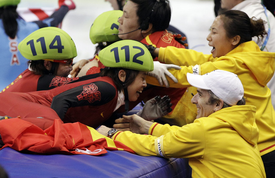 当地时间2月24日,温哥华冬奥会女子短道速滑3000米接力A组决赛中,中国队王濛、周洋、孙琳琳、张会四朵金花联袂出击,最终将金牌归入中国队囊中。图片来源:中国新闻网