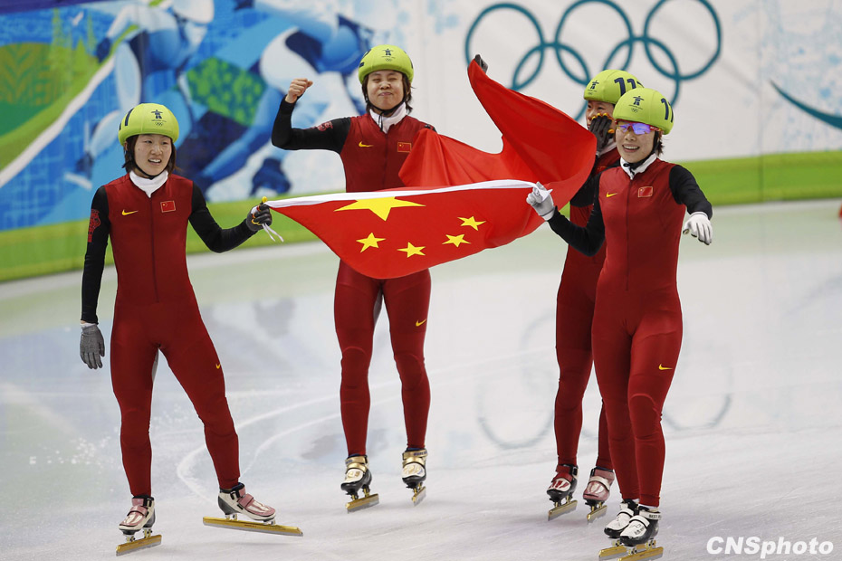 当地时间2月24日,温哥华冬奥会女子短道速滑3000米接力A组决赛中,中国队王濛、周洋、孙琳琳、张会四朵金花联袂出击,最终将金牌归入中国队囊中。图片来源:中国新闻网