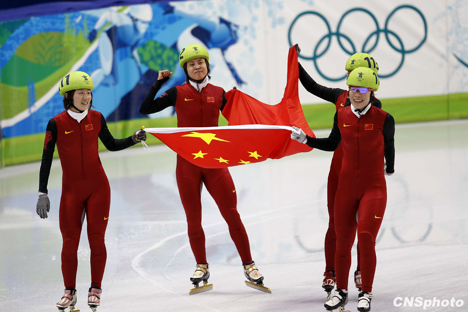 当地时间2月24日,温哥华冬奥会女子短道速滑3000米接力A组决赛中,中国队王濛、周洋、孙琳琳、张会四朵金花联袂出击,最终将金牌归入中国队囊中。图片来源:中国新闻网